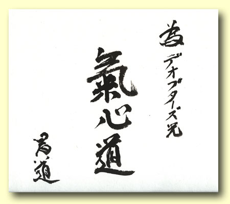 Calligraphie réalisée et offerte, le 1octobre 2008, par maître Masamichi Noro à maître Michel-Laurent Dioptaz. (voir site de M.L.Dioptaz:www.dioptaz.com)