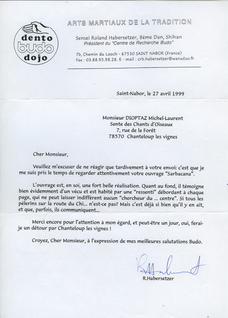 Lettre de Roland Habersetzer à Michel-Laurent Dioptaz en écho à l'ouvrage "Sarbacana" (27 avril 1999).